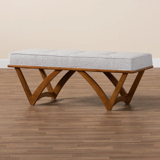 Chenoa Japandi Light Grey Boucle Fabric and Walnut Brown Finished Wood Bench