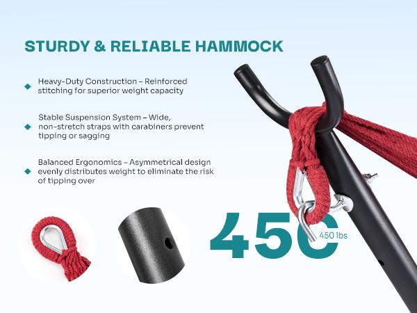 - Double Hammock: This hammock featuring a sturdy steel stand designed for robustness the hook with metal buckle. 450-pound weight capacity easily accommodates up to two people at once.