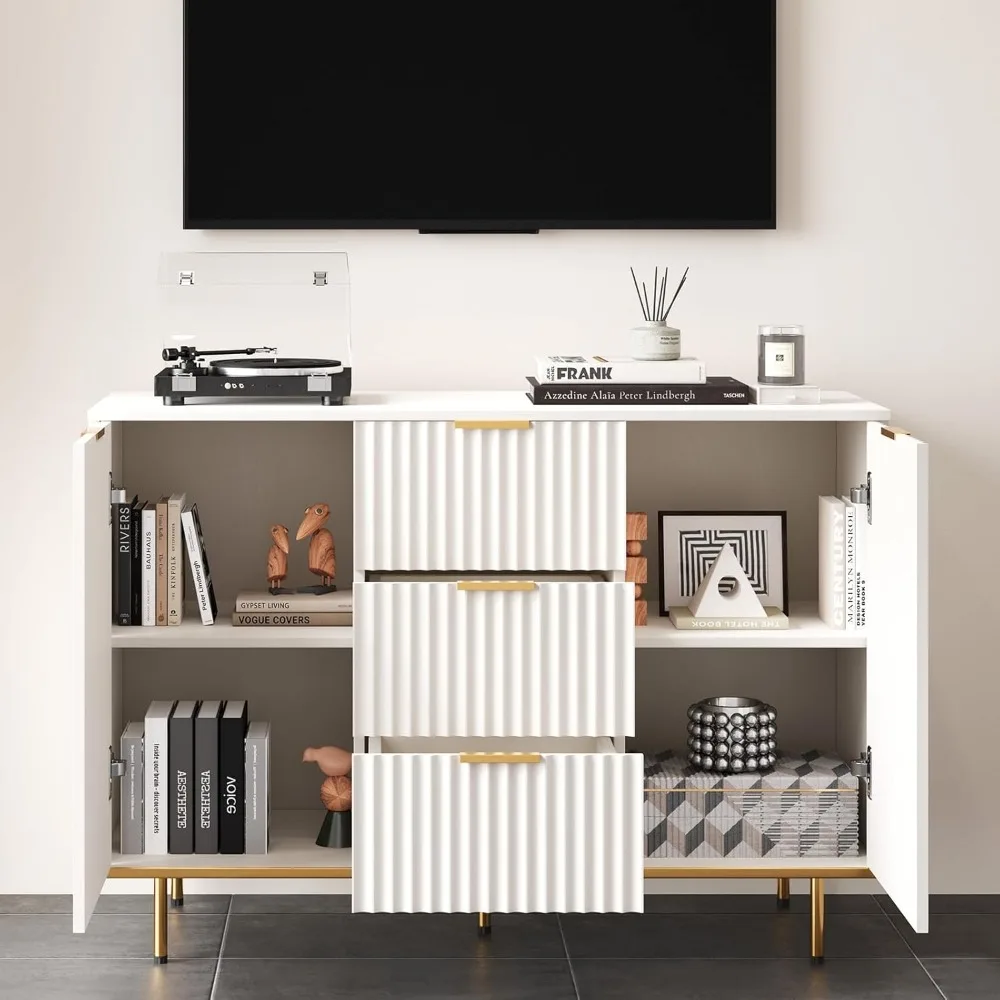- Stylish Storage Furniture: Enhance your space with this storage furniture featuring a modern fluted design and gold details. Perfect for use as a media console cabinet or buffet cabinet with drawers, it blends seamlessly with dining room or living room decor.